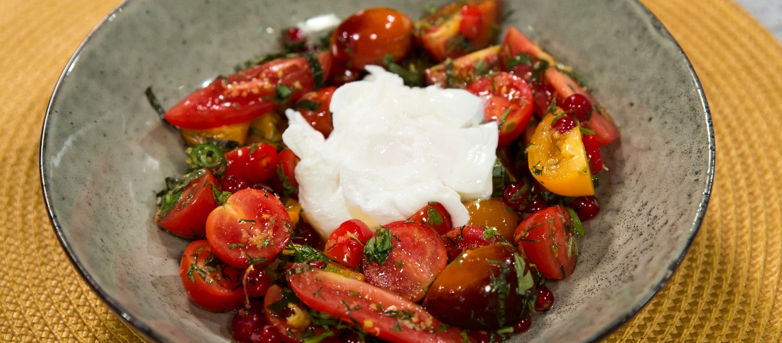 Keverjük össze a paradicsomot, ribizlit, a citrom levét, a citrom héját, kaprot, koriandert, a bazsalikom egy részét, és egy nagy adag sót. 30 percig hagyjuk pihenni!