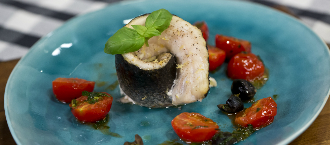 Félbevágjuk a cherry paradicsomokat, sózzuk, kapribogyót és olívabogyót adunk hozzá, fűszerezzük oregánóval, petrezselyemmel és bazsalikommal. A sügért citromhéjjal, sóval, borssal és fokhagymával ízesítjük. Feltekerjük a filét és 180 fokon 18 perc alatt készre sütjük. A mártásra tálaljuk a sügértekercset.