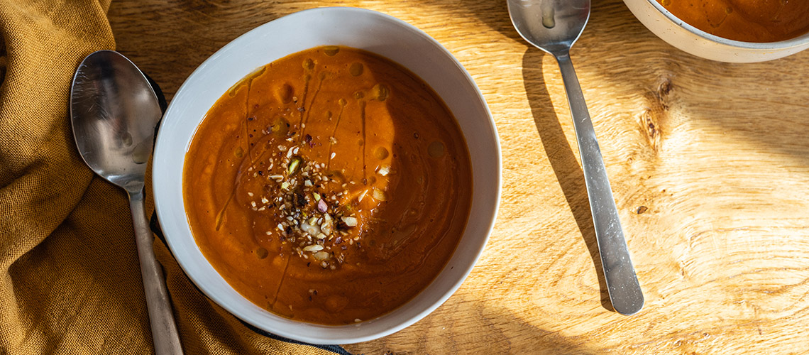 Egy fej hagymát finomra vágunk és egy nagy lábasban megdinszteljük kevés olajon. Az illatosra sült tök húsát kikaparjuk és a lábasba tesszük a hagyma mellé, majd a megsült fokhagymákat is belenyomkodjuk. Sózzuk, borsozzuk, beleszórjuk az őrölt gyömbért, az őrölt római köményt, a kurkumát, a borsot és a chilit, majd felöntjük a passzírozott paradicsommal és az alaplével. Összefőzzük, ha szükséges higítjuk még vízzel vagy alaplével. Ha jól összefőtt, az egészet pürésítjük.
