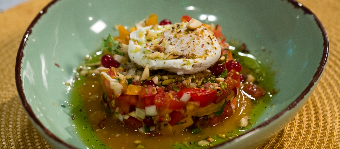 A paradicsom tatárhoz a színes paradicsomokat nagyon apróra vágjuk. Egy tálban összekeverjük és ízesítjük aprított zöldfűszerekkel, citrom levével és a ribizlivel. Ha kicsit összeértek az ízek gyűrűbe halmozzuk.