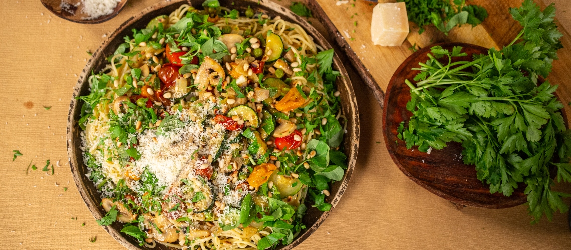 A paradicsomos keverék alatt ismét begyújtunk, kissé összerottyantjuk, majd összeforgatjuk a felaprított petrezselyemmel és bazsalikommal. Egy tálban összeforgatjuk a kifőtt tésztát a cukkinis szósszal és megszórjuk a tetejét a paradicsomokkal, végül a maradék reszelt parmezánnal és fenyőmaggal.