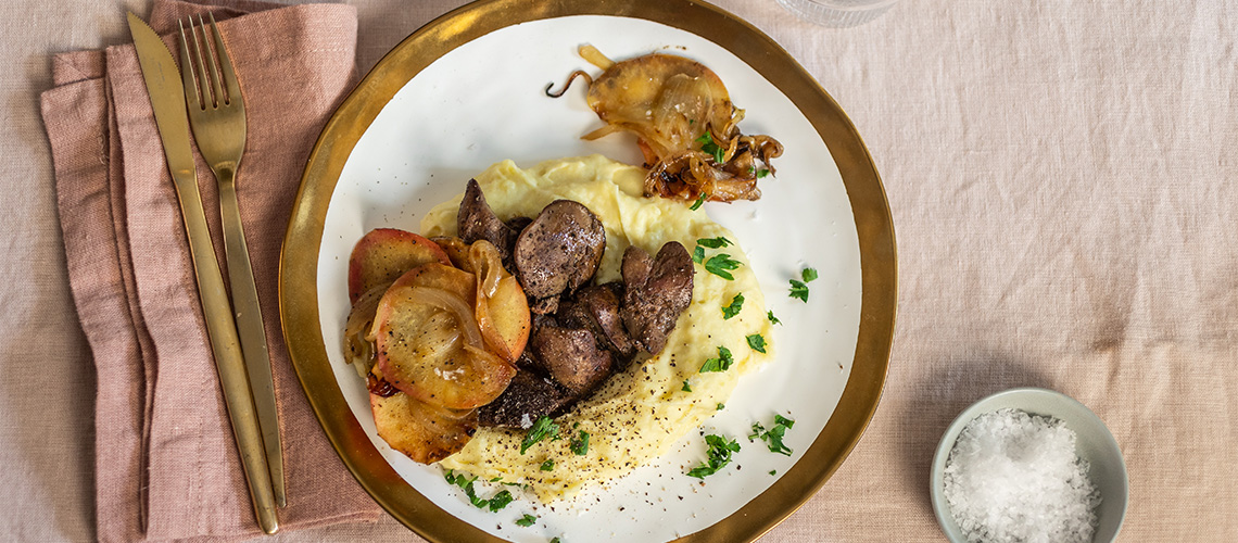A serpenyőbe ismét vajat és olajat teszünk, felhevítjük és magas hőmérsékletre állítjuk a tűzhelyet. A serpenyőbe tesszük a májat és oldalanként 2-2 percig pirítjuk, közben borsozzuk. Közepesen erős lángon további 2 percig főzzük rázogatva, majd sózzuk és a májat kiszedjük a serpenyőből. Félretesszük és melegen tartjuk.