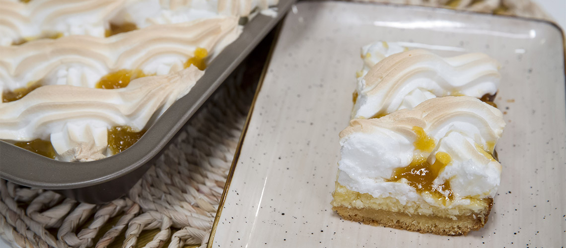 A cukor harmadával felverjük a fehérjét, majd hozzácsurgatjuk lassan a cukorszirupot, majd kihűlésig habbá verjük. Rákenjük a picit kihűlt süteményre. Tetejét porcukorral szórjuk sütés előtt. 15-20 perc alatt 140 fokon rászárítjuk a habot.