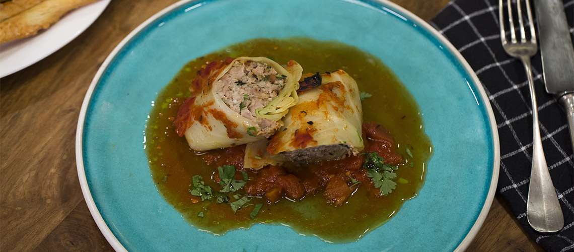 Fejtsük le a káposztáról a leveleket (először akár blansírozhatjuk is). Fűszerekkel, hússal, tojással és liszttel képezzünk masszát, amit a káposztalevelekbe töltünk, amiket a tepsibe fektetünk. A szószt paradicsomból, alapléből és fűszernövényekből készítjük el, majd ráöntjük a gombócokra és fedő alatt 180 fokon kb. fél órát sütjük, majd fedő nélkül még 15 percig.