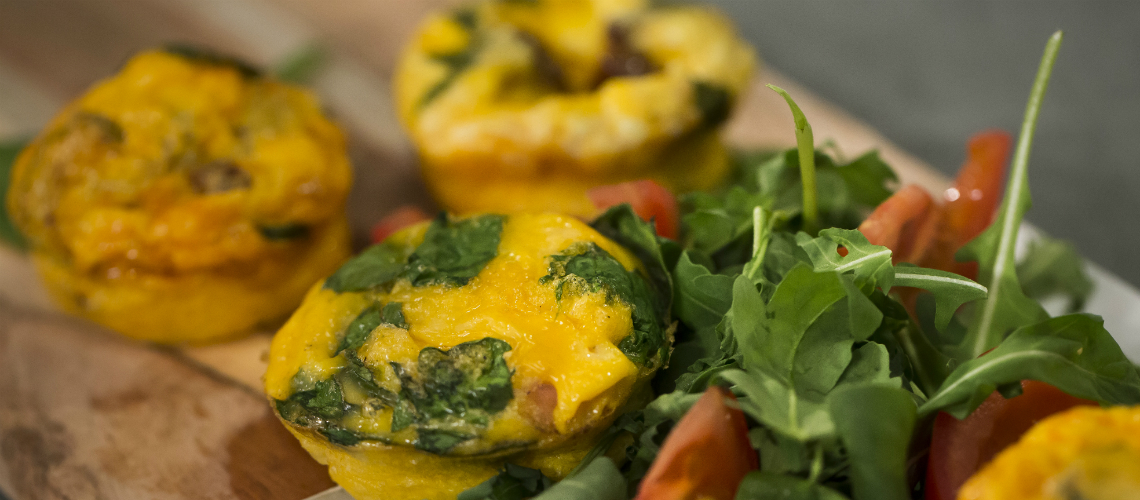 A bacont, a kolbászt és a cukkinit feldaraboljuk és kevés olajon lepirítjuk. Közben a tojásokat felütjük és felverjük, ízesítjük sóval és őrölt borssal. Hozzáadjuk a tejet. A muffintepsi mélyedéseit kikenjük vékonyan olajjal, majd mindegyikbe merünk a felvert tojásból és ízlés szerint gazdagítjuk a feltétekkel: sült bacon, kolbász, cukkini, morzsolt feta, aprított aszalt paradicsom, vagy spenótlevél kerülhet bele. Megszórjuk a reszelt sajttal. majd 175 fokon készre sütjük.