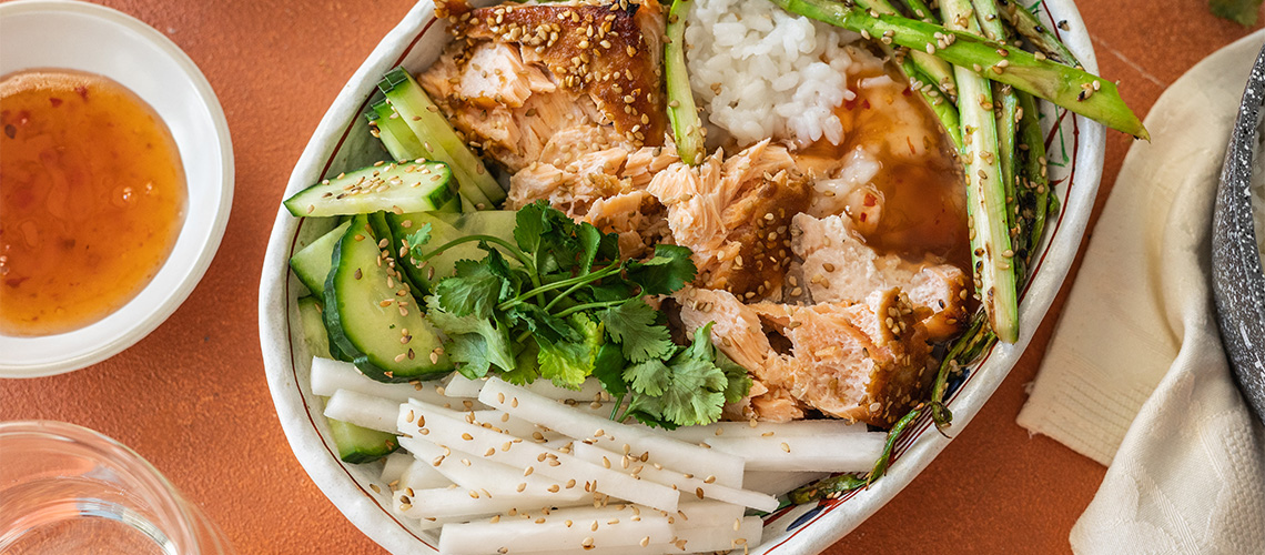 Tálaláskor egy bowlba szedünk a rizsből, a pirított spárgából és elhelyezünk mellette 1 szelet lazacot, szeletekre vágott uborkával és vajretekkel. Adhatunk mellé egy kevés édes chiliszószt s friss koriandert is.