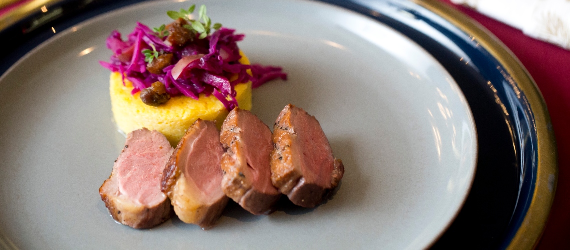 A szobahőmérsékletű kacsamell darabokról papírtörlővel felitatjuk a nedvességet és beirdaljuk (csak a bőrét és a zsírréteget vagdossuk be). Közepes hőmérsékleten melegített serpenyőbe helyezzük bőrével lefelé, mindenféle zsiradék nélkül. Sózzuk, borsozzuk a húsos oldalát. Amikor a bőrös oldal jól átsült megfordítjuk, sózzuk-borsozzuk azt az oldalát is. Miután ez az oldal is átsült, kirakjuk egy tányérra pihenni. Egy zsírpapírral bélelt edénybe helyezzük a húst, mellé néhány vajkockát, kakukkfüvet, 2-3 darab fokhagymát rakunk, és 8 percig sütőben sütjük. Tálaláskor meglocsoljuk a kisült zsírral.