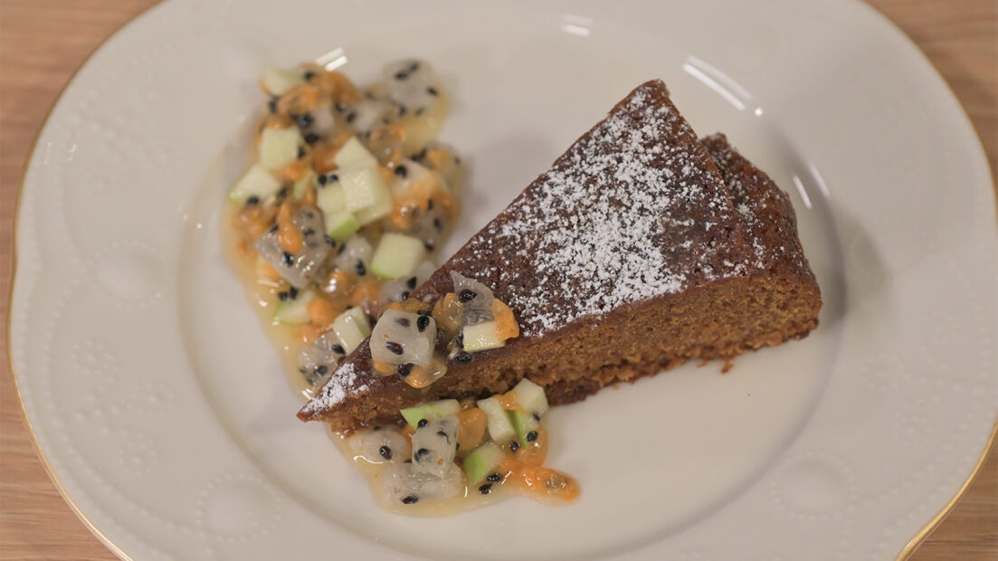 A sütőt előmelegítjük 180C fokra. Egy nagy tálban felütjük a két tojást, hozzáadjuk a cukrot, és elektromos kézi keverővel (vagy robotgépben) fehéredésig, habosra keverjük. Beleöntjük az olajat, a mézet, ezzel is sűrűre keverjük. Jöhet hozzá a rum és a kávé, tovább keverjük. Egy külön tálba tesszük a lisztet, hozzákeverjük a sót, sütőport, szódabikarbónát, fahéjat, majd az egészet átszitáljuk a mézes masszába. A szitálástól finomabb lesz az állaga, nem érdemes elhagyni (sima szűrő is megfelel, ha nincs szitánk). Egy nagyobb, 28 cm átmérőjű tortaformát kikenünk kevés olajjal, és meghintjük kevés liszttel, majd beleöntjük a tortamasszát. Kb. bő egy óráig sütjük, tűpróbával ellenőrizzük, hogy megsült-e a közepe. 60 perc után már érdemes ellenőrizni. Ha menetközben nagyon pirulna a teteje, akkor érdemes lazán leteríteni egy sütőpapírral. Teljesen kihűtjük. Érdemes 1-2 nappal korábban megsütni, és alufóliába csomagolni, mert még finomabb lesz, ha áll néhány napig. A sült almához eltávolítjuk az almák csumáját, felkockázzuk (hámozni nem szükséges), és megcsepegtetjük a citromlével, hogy ne barnuljon. Egy jó nagy serpenyőben (amiben elfér az összes alma, és amit be lehet tenni a sütőbe) felolvasztjuk a vajat, majd addig pirítjuk, amíg édeskés-diós illata lesz. Ekkor beletesszük az almákat, és néhány percig pirítjuk, amíg némi színt kap, de még nem kezd el puhulni. Ráöntjük a mézet, pár másodpercig erős lángon kevergetjük, majd 230C fokos sütőbe tesszük kb. 6 percre. Langyosan tálaljuk a süteményhez, adhatunk hozzá vaníliás mascarponét, vagy vaníliafagylaltot is.