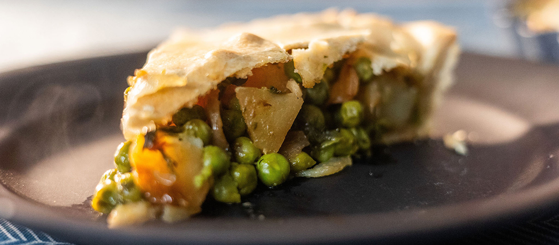 A tésztát enyhén lisztezett deszkára borítjuk, és az 1/3-át félretesszük. A többit kinyújtjuk és egy piteformába simítjuk. Megtöltjük a kihűlt töltelékkel. A félretett tésztát is kinyújtjuk, a pite tetejére borítjuk, és a széleken összenyomkodjuk. Megszurkáljuk a tetejét, és lekenjük zabtejjel, majd 200 fokra előmelegített sütőbe tesszük, 55-60 perc alatt készre sütjük. Közben néha ránézünk, hogy ne égjen meg. A sütőből kivéve hagyjuk langyosra hűlni, mielőtt felszeletelnénk.