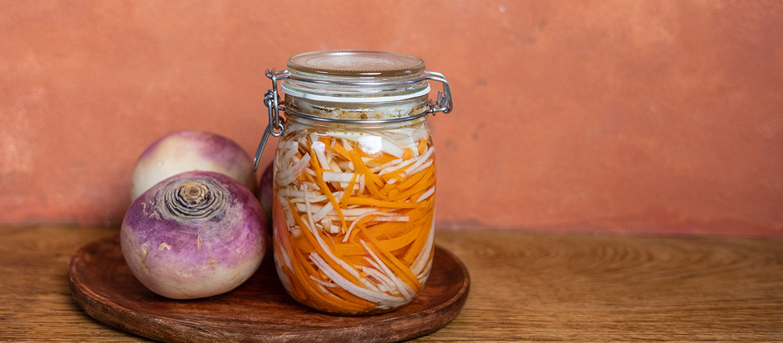 A sárgarépát és a tarlórépát egyforma, vékony csíkokra vágjuk és egy nagyobb befőttesüvegbe szorosan lerétegezzük. Egy közepes lábasban felforraljuk a vizet a fűszerekkel, az ecettel, sóval és a cukorral, majd ezt a befőttesüvegbe öntjük, Leforrázzuk vele a zöldségeket. Lezárjuk a befőttesüveget és pár napig hagyjuk állni a savanyúságot mielőtt fogyasztjuk, de az az igazi, ha egy hetet áll.