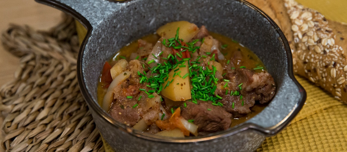 Egyenlő darabokra vágjuk a húst, a zöldséget. A húst egy serpenyőben megpirítjuk, hozzáadjuk a mustárt, megsütjük és bezöldségezzük. Öntsük fel borral, forraljuk el, adjunk hozzá alaplét. Burgonyát teszünk a fazékba, pároljuk, amíg a folyadék majdnem elforr. Végül beletesszük a paradicsomot, és apróra vágott metélőhagymával vagy zöld fűszerekkel megszórjuk.