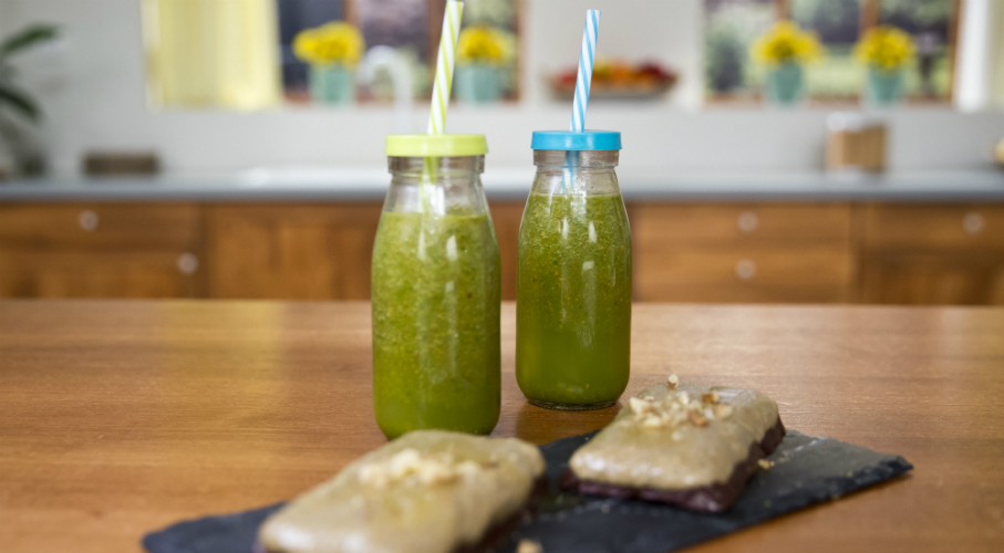A hozzáavlókat a turmixgépbe tesszük, majd összeturmixoljuk. Zöldcitrommal és aprított spenóttal tálaljuk.