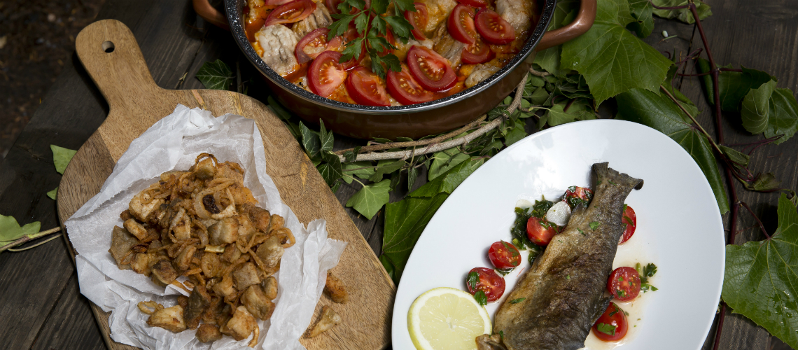 A pisztrángokat vágott petrezselyemmel és szeletelt fokhagymával megtöltjük, sózzuk, borsozzuk és lisztben forgatva, kevés olajban pirosra sütjük. A ponty szálkamentes hasa alját levágjuk, felkockázzuk és fűszerpaprikás, sós, borsos zsemlemorzsával kevert lisztbe forgatjuk. Bő forró olajban hirtelen ropogósra sütjük. Kb. 4 db hagymát felkarikázunk, megszórjuk a lisztes, fűszeres keverékkel és szintén pirosra sütjük. A maradék pontyfilét két ujjnyi csíkokra vágva beirdaljuk. Sózzuk, majd kevés forró olajban kisütjük. A maradék zsiradékban lepirítjuk a 3 db szeletelt vöröshagymát, kevés fűszerpaprikával szórjuk. Hozzáadjuk a csíkozott paprikákat. Sózzuk, majd néhány perc forralás után beletesszük a cikkezett paradicsomot. Egybeforgatjuk és a sült ponttyal tálaljuk.