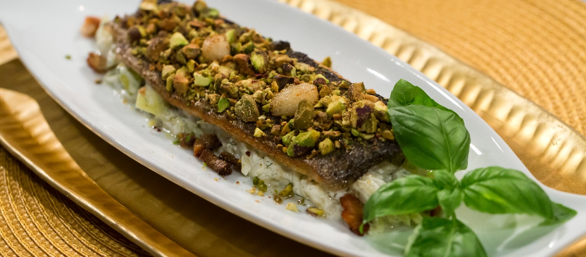 A pisztáciát lepirítjuk, majd ha kihűlt, egy aprítóban morzsává zúzzuk és a halra halmozzuk tálaláskor.