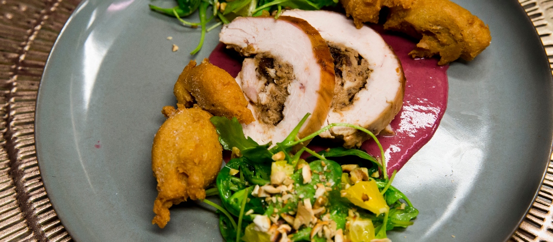 Tálaláshoz a salátát összeforgatjuk pár narancsdarabbal, a mártást a tányérra öntjük, ráhelyezzük a felszeletelt húst, mellé a kroketteket, a salátát.