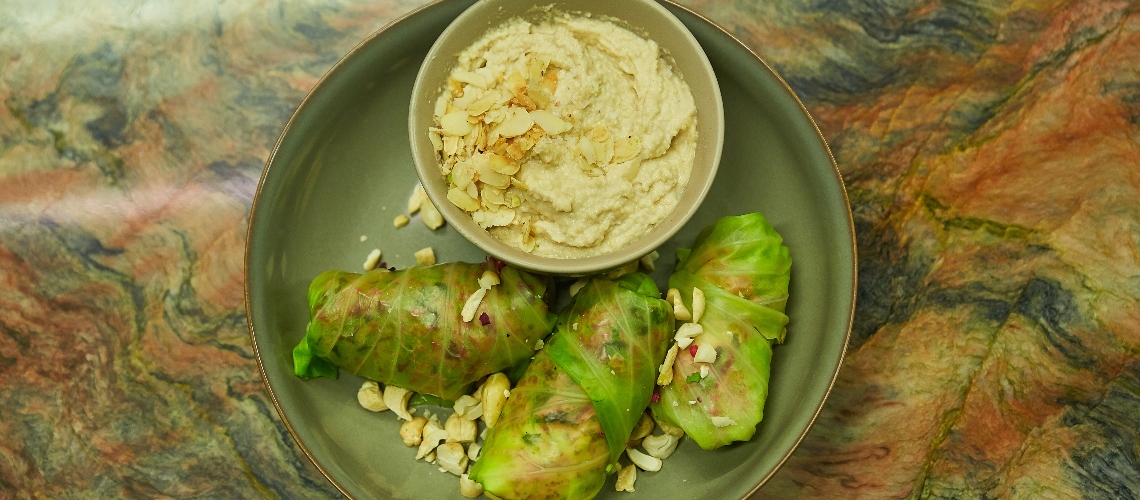 A töltelékhez összekeverjük a főtt bulgurt a nyers, reszelt céklával. Száraz serpenyőben tökmagot pirítunk, kicsit hagyjuk hűlni, majd késsel durvára daraboljuk, hozzákeverjük a töltelékhez. Megy bele még egy kis friss, reszelt torma, és citromhéjat is reszelünk bele. Sózzuk, borsozzuk, hozzáadjuk a finomra vágott petrezselymet. A kecskesajtot belemorzsoljuk és ezzel is összeforgatjuk. Megtöltjük és szorosan feltekerjük a batyukat.
