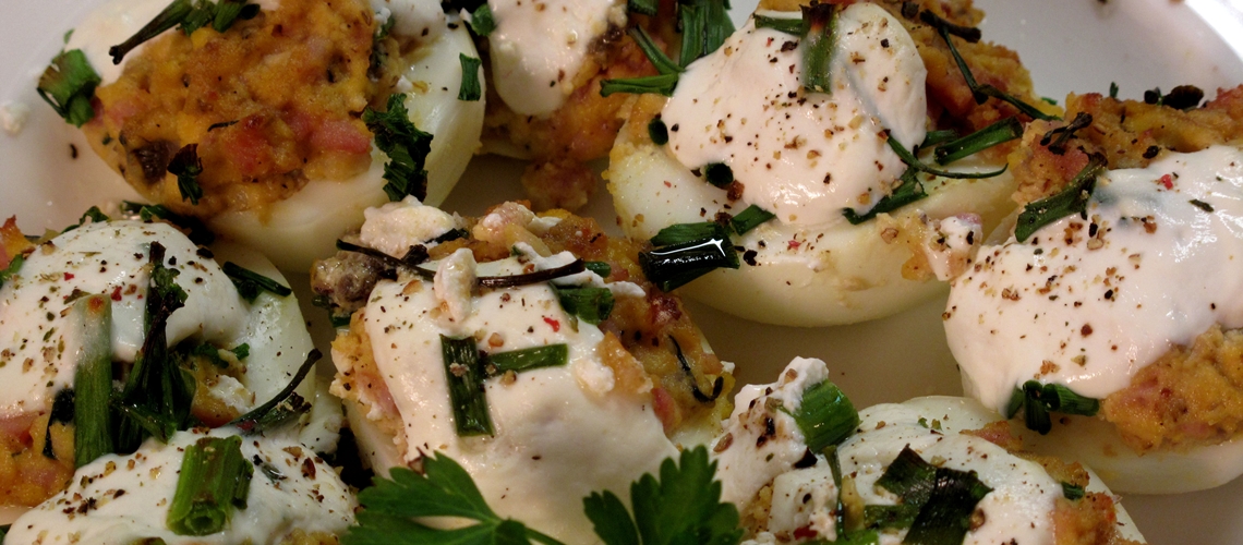 10 tojást főzünk keményre, kihűtjük, majd megfelezzük őket, vegyük ki a sárgájukat, a fehérjéket pedig egy kizsírozott tepsibe helyezzük. A 25 dkg sonkát és 25 dkg gombát apróra vágjuk a snidling felével együtt. 4 evőkanál libazsírral együtt rövid ideig pirítsuk langyos tűzön, sózzuk, borsozzuk. Majd adjuk hozzá az összetört tojás sárgákat és a fűszereket.
