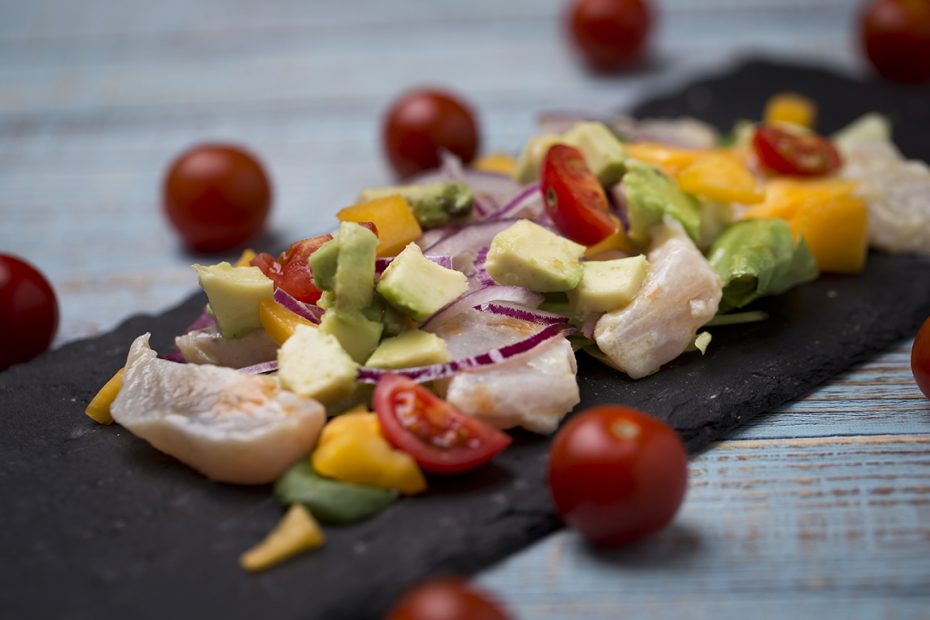 A tonhal darabokat egy tálba tesszük, meglocsoljuk a lime levével és egy pici olívaolajjal, majd néhány órára hűtőbe tesszük. A felszeletelt hagymát jéghideg vízbe áztatjuk legalább egy órára, hogy elvegyük az erősségét. A tonhalat, a hagymát, a koktélparadicsomot, az avokádót, valamint a petrezselymet egy tálban összekeverjük, meglocsoljuk a lime levével, és sózzuk, borsozzuk.