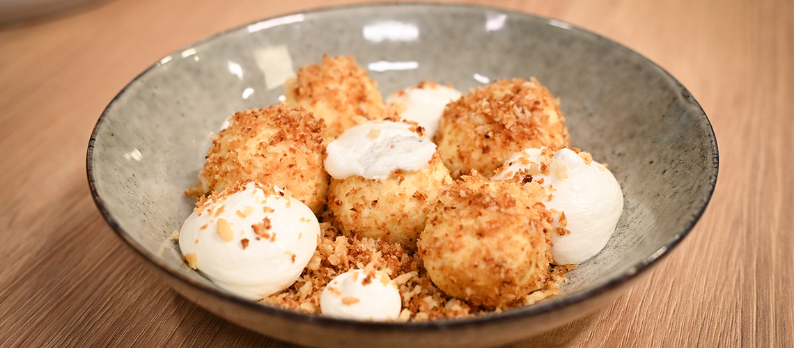 Elkészítés: A hozzávalókat összekeverjük és a kevert gombócalapot pihentetjük 10 percig. Tetszés szerinti méretű gombócokat formázunk belőlük és forrásban lévő vízben addig főzzük, amíg fel nem jönnek a víz tetejére. Utána még pár percet főzzük, majd kivesszük őket, lecsepegtetjük és a pirított morzsába forgatjuk. A tálaláshoz szifonban összekeverjük a tejszínt a tejfölt és a cukrot, és ezzel díszítjük a gombócokat.