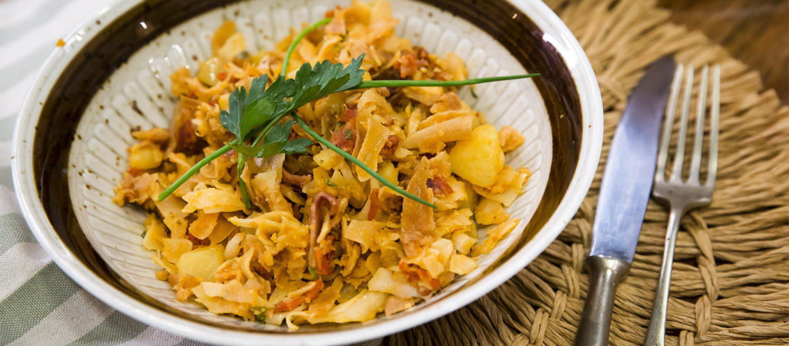 A csusza tésztát tepsibe tesszük, és sütőben ropogósra pirítjuk. A szalonnát kockára vágjuk, zsírjára sütjük. Beletesszük a felkockázott hagymát, dinszteljük. Félre húzzuk, rászórjuk a fűszerpaprikát, hozzáadjuk a felkockázott krumplit. Felöntjük annyi vízzel, ami éppen ellepi. Kerülhet bele egész paprika, paradicsom is. Ha már majdnem készre főtt, hozzáadjuk a pirított tésztát is. Újra felöntjük, mindig kevés vízzel, egészen addig, amíg meg nem puhul. Tehetünk bele pirított kolbász karikákat is. Ha minden elkészült, melegen tálaljuk.