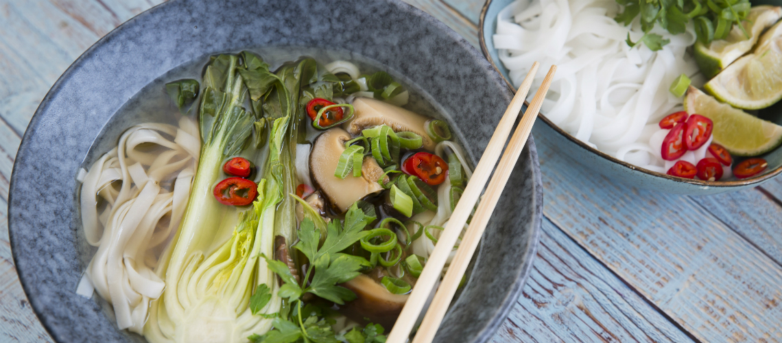 Először előkészítjük a száraz fűszereket: száraz serpenyőben illatosra pirítjuk a csillagánizst, szegfűszeget és borsot. Előkészítjük a gyömbért és a hagymát –ez a lépés plusz munka, de nagyon fontos: legmagasabb lángon teljesen felforrósított serpenyőbe helyezzük vágott felületével lefelé a gyömbért és a hagymát, feketedésig pirítom. Gáztűzhelyen a nyílt láng fölé is lehet tartani. Egy lábasba tesszük az alaplevet a fűszereket, a gyömbért, hagymát, a szárított gomba áztatólevét és a felszeletelt gombát. Felforraljuk, majd alacsony hőfokon 20 percig gyöngyöztetjük, hogy a lé átvegye a fűszerek aromáját. A végén beletesszük a zöldséget, azt éppen csak fél percig főzzük, hogy még ress maradjon. A rizstésztát forró vízbe áztatjuk. Tálaláskor a tésztára merjük a forró levest, mindenki adagjára teszünk a zöldségből, majd a kiegészítőket mellé tálaljuk, hogy mindenki ízlés szerint tegyen belőle.