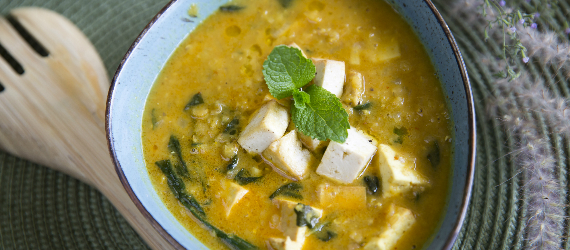 Olajban pirítsuk meg a hagymát, adjuk hozzá a curry pasztát, s vöröslencsét, a spenótot és öntsünk föl vízzel. Fűszerezzük, főzzük puhára. A végén kókusztejjel gazdagítjuk. Serpenyőben tofut pirítunk, együtt tálaljuk.