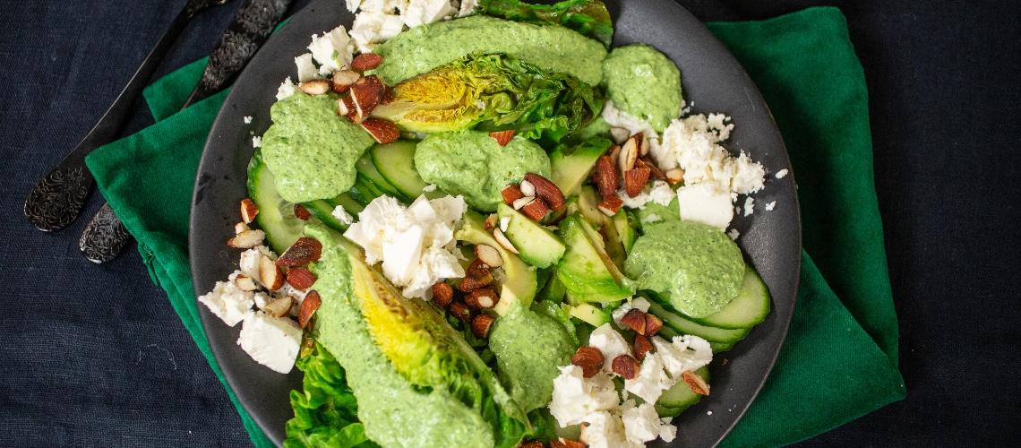 Az öntethez tegyük egy késes aprítóba a zöldfűszereket, a fokhagymával, újhagymával, citromlével, sóval és dolgozzuk teljesen simára.