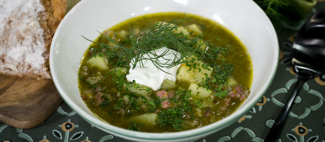 Miután megpirult hozzáadom a sóskát, sózom és borssal, babérlevéllel fűszerezem. Ráöntöm a sűrített burgonyás levest és egybeforralom. Apró kockázott főtt marhahússal, friss vágott kaporral és petrezselyemmel, valamint tejföllel tálalom.