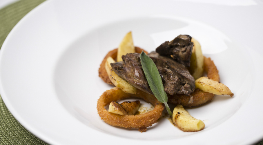 Kevés vajat felolvasztunk, rádobjuk a sózott, borsozott csirkemájat és mérsékelt tűzön konyakkal és friss zsályával együtt megsütjük. A maradék vajban megpirított almakarikákkal és a bő, forró olajban sütött, bepanírozott hagymakarikákkal tálaljuk.