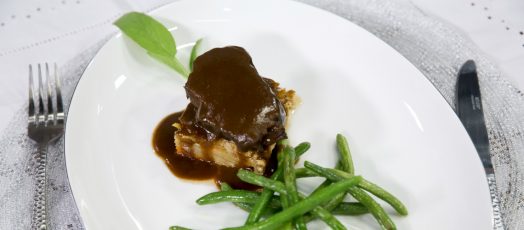 Marhapofa ceruzababbal, gratinírozott gyökérzöldségekkel