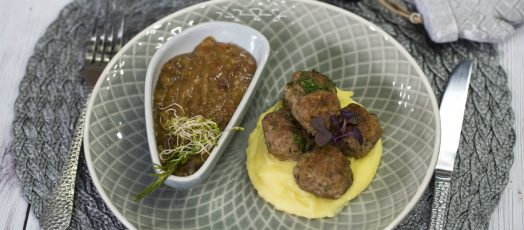 Szegfűszeges húsgombócok, csípős szilvamártással, burgonyapürével