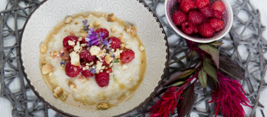 Sushi rizs kókusztejjel, vaníliás málna és sóskaramell édesköménnyel