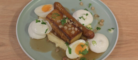 Flank stake karamellizált sütőtökkel, színes céklákkal, kecskesajttal és eper pürével marinált salottahagymával