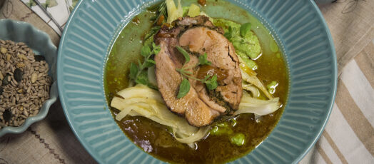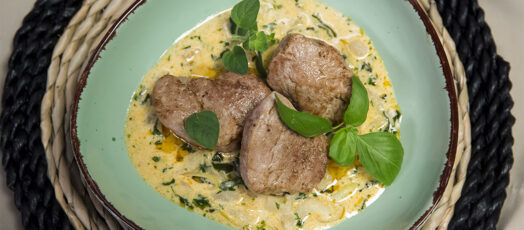 Sertésszűz dijoni mártással, gránátalmával és citrusos zellerrel