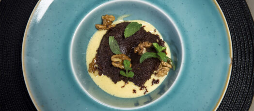 Csokis brownie pisztáciával, áfonyával és angolkrémmel