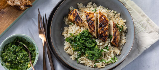 Joghurtos csirkenyárs mandulás rizzsel és koriander pesztóval