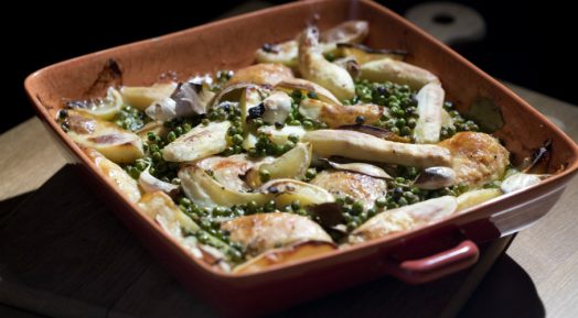 Tepsis Csirkecomb Vele Sült Krumplival, Zöldborsóval
