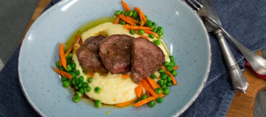 Borjúhús burgonyapürével, sárgarépával és borsóval