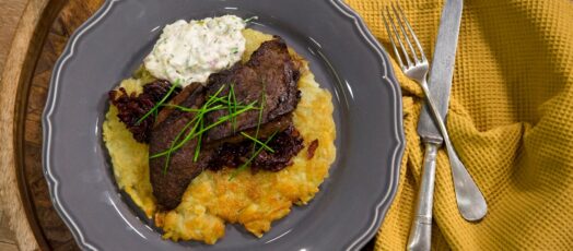 Borjúmáj hashbrown burgonyával és hagymalekvárral