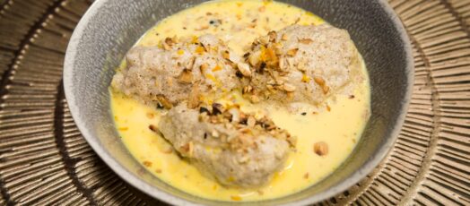 Mentes vaníliás madártej (laktózmentes tejjel) narancsosmézes kalácsos habbal, pirított magvakkal
