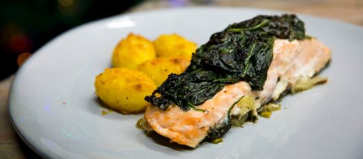 Spenótos édesköményes lazac kurkumás sült burgonyaval