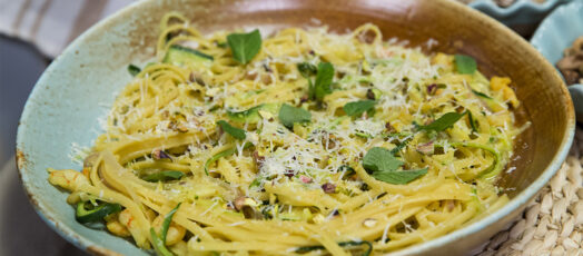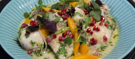 Kókuszos csirke gyökérzöldséggel, gránátalmával
