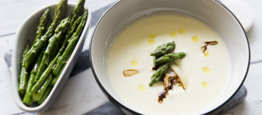 Spárgaleves petrezselyemchipszel és metélőhagyma olajjal