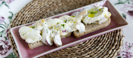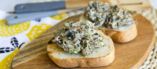 Pirított fehér kenyér fokhagymával, erdei gombával, kakukkfűvel és friss sajttal