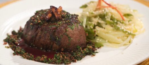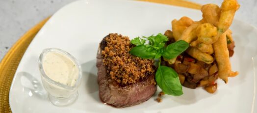 STEAK ZÖLDFŰSZERES BACONOS KÉREGBEN, SZEZÁMOS KRUMPLIVAL, GYÜMÖLCSMÁRTÁSSAL