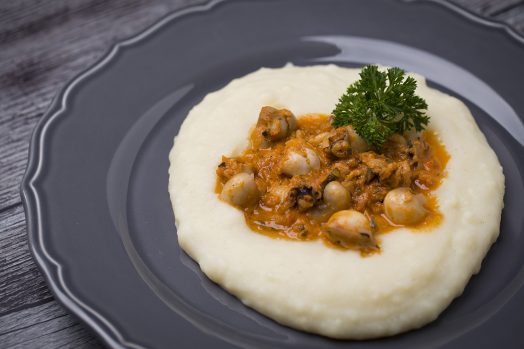 Fehérboros Tintahal Paradicsomszószban Puliszkával