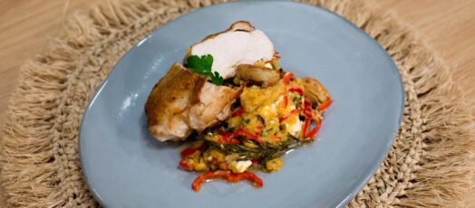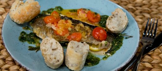 Fűszeres pisztrángsült citrommal, fehérboros mártással és pesztóval